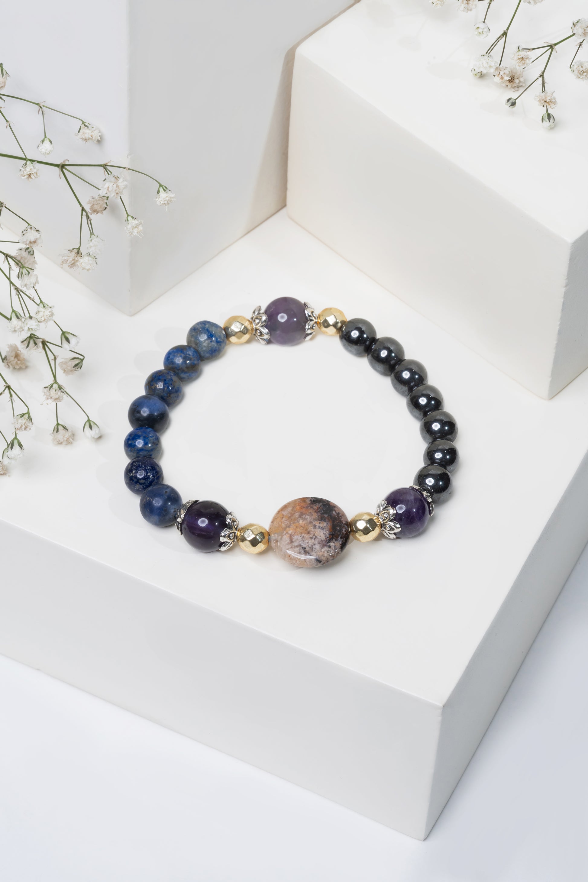 This bracelet features Lapis, Hematite, and Amethyst with a Big Black Fossil Coral Flat Bead, designed to support hormonal equilibrium and cellular healing.